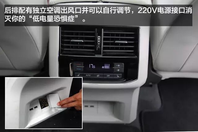 即使是第二排的乘客同样照顾,独立空调出风口可以自主调节,并且后排有贴心的220V电源借口以及两个USB接口,外出旅行解决你的“电量恐惧症”,,当然,手动遮阳帘虽然缺少些高贵感,但好在聊胜于无。
