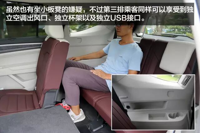 在最考验厂家诚意的第三排乘坐体验上,途昂可以说同样富有诚意,虽然也有坐小板凳的嫌疑,不过这个空间应对短途旅行足以,最为关键的是,第三排乘客同样可以享受到独立空调出风口、独立杯架以及独立USB接口,虽然空间上无法给第三排乘客交出高分答卷,但是在其他方面已经得到弥补。