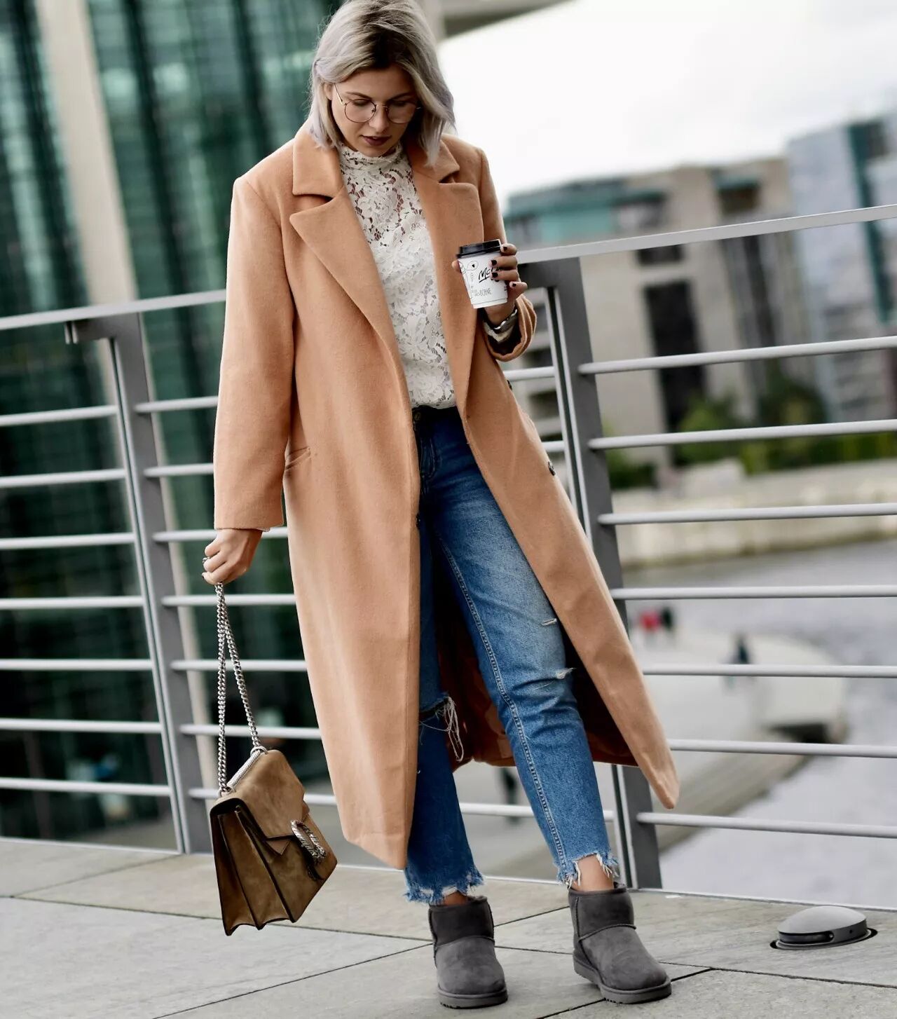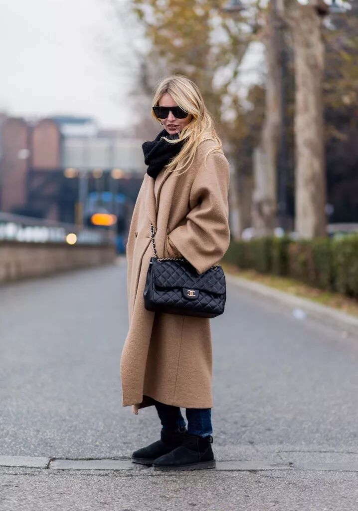 驼色大衣和驼色雪地靴同色相互呼应,整体造型立马高级又质感!谁说雪地穿不出时髦范儿!