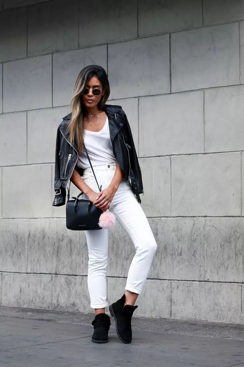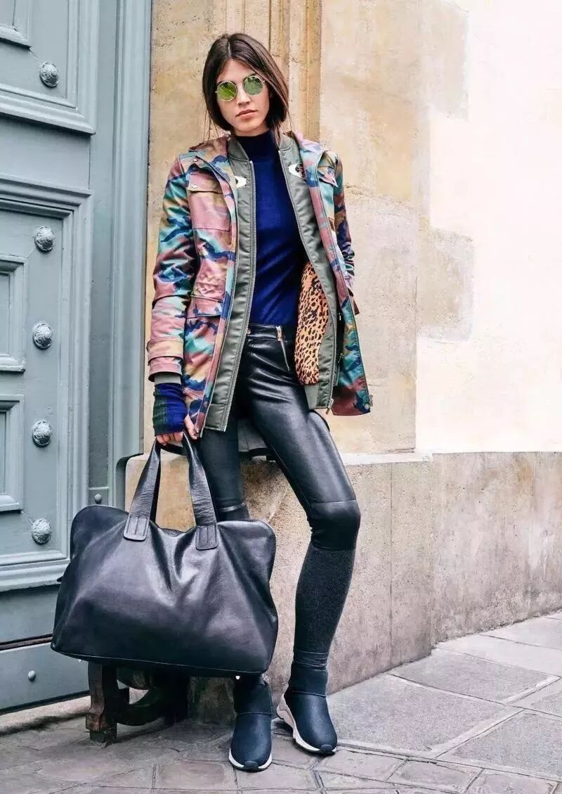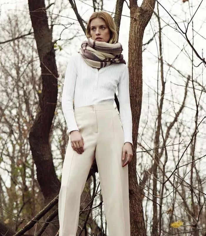 除了牛仔裤还可以搭配白色小脚裤,将小脚裤挽进筒靴里,无论是搭配高领针织还是oversize毛衣,街拍感都非常强烈。