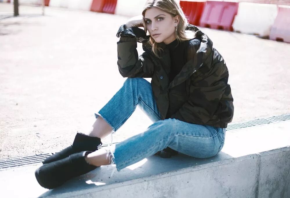 迷彩羽绒服九分牛仔裤搭短筒黑色雪地靴,双重保暖还休闲中带着小时髦!