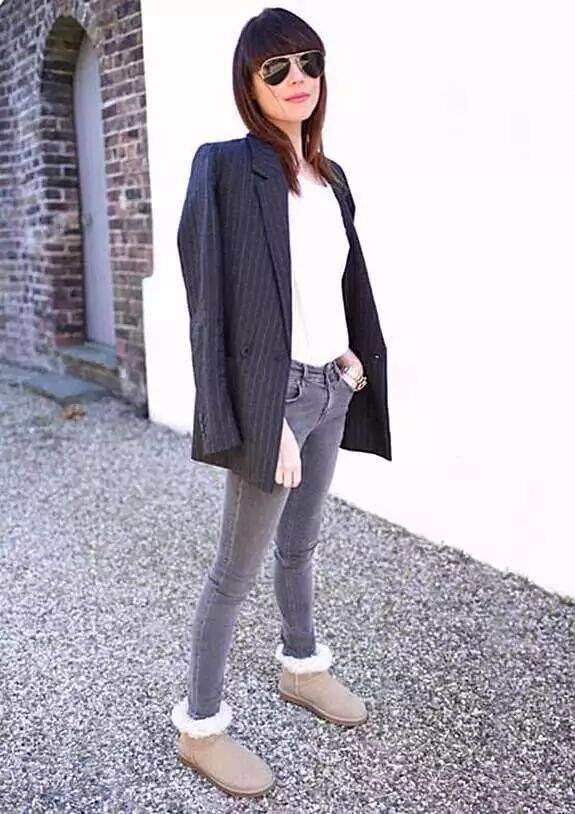 条纹西装+小脚裤搭配低筒雪地!丝毫没有任何影响简约造型!还是腿看起来修长不少!
