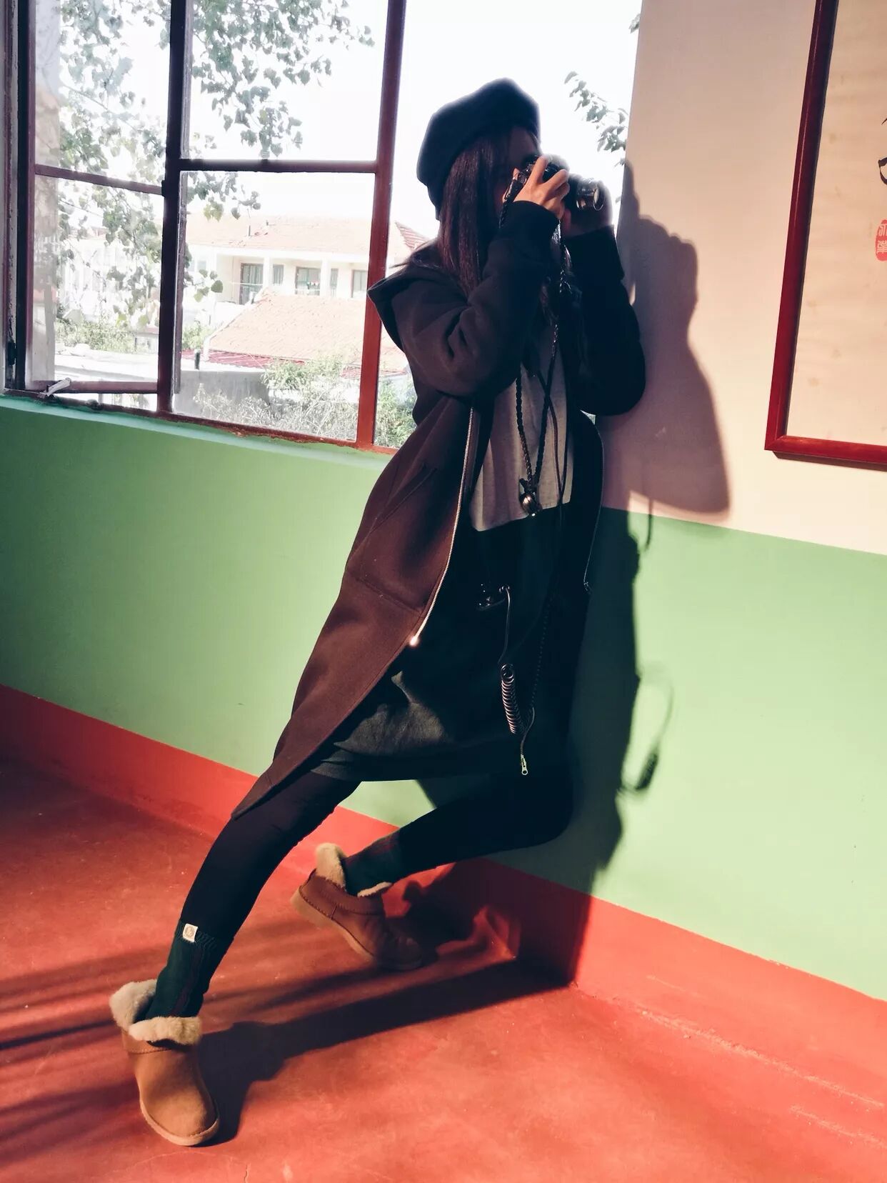 驼色雪地靴将黑色大衣黑色短靴提不少视觉感!搭配黑色连裤袜也不会突兀,影响整体look,文艺气息十足!