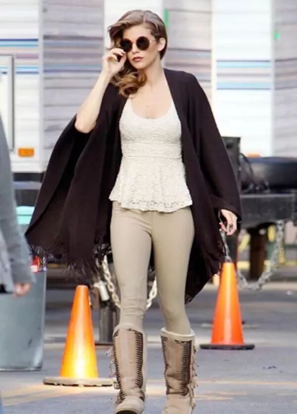 相同造型legging上身,下图长筒靴让腿看起来短粗不少!上面轻轻松松穿出一套休闲风!