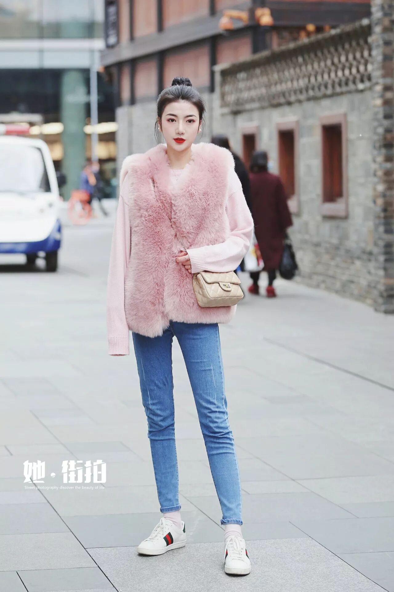 粉色一定是很多女孩难以割舍的情结,就像妈妈永远觉得你就是个天真可爱需要人呵护的小孩。柔软的粉色圆领毛衣+粉色仿皮草马甲,同色系的搭配让粉色也能立现高级范儿的少女感,既有少女的粉嫩娇美也不会过分的矫揉幼齿。粉色的梦幻就像自带了三千万的柔光,显得特别的白净健康。
