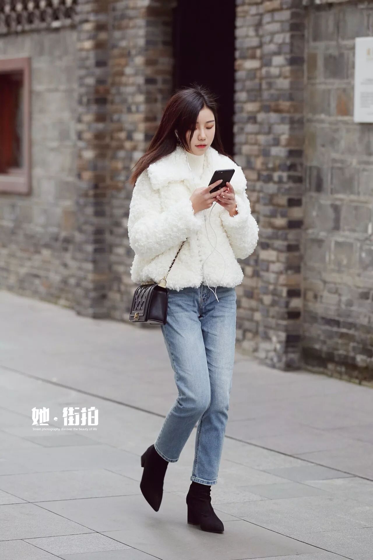 外搭羊羔毛短外套,卷曲的蓬松的羊羔毛,温暖的触感让白色多了一分温厚的触感。