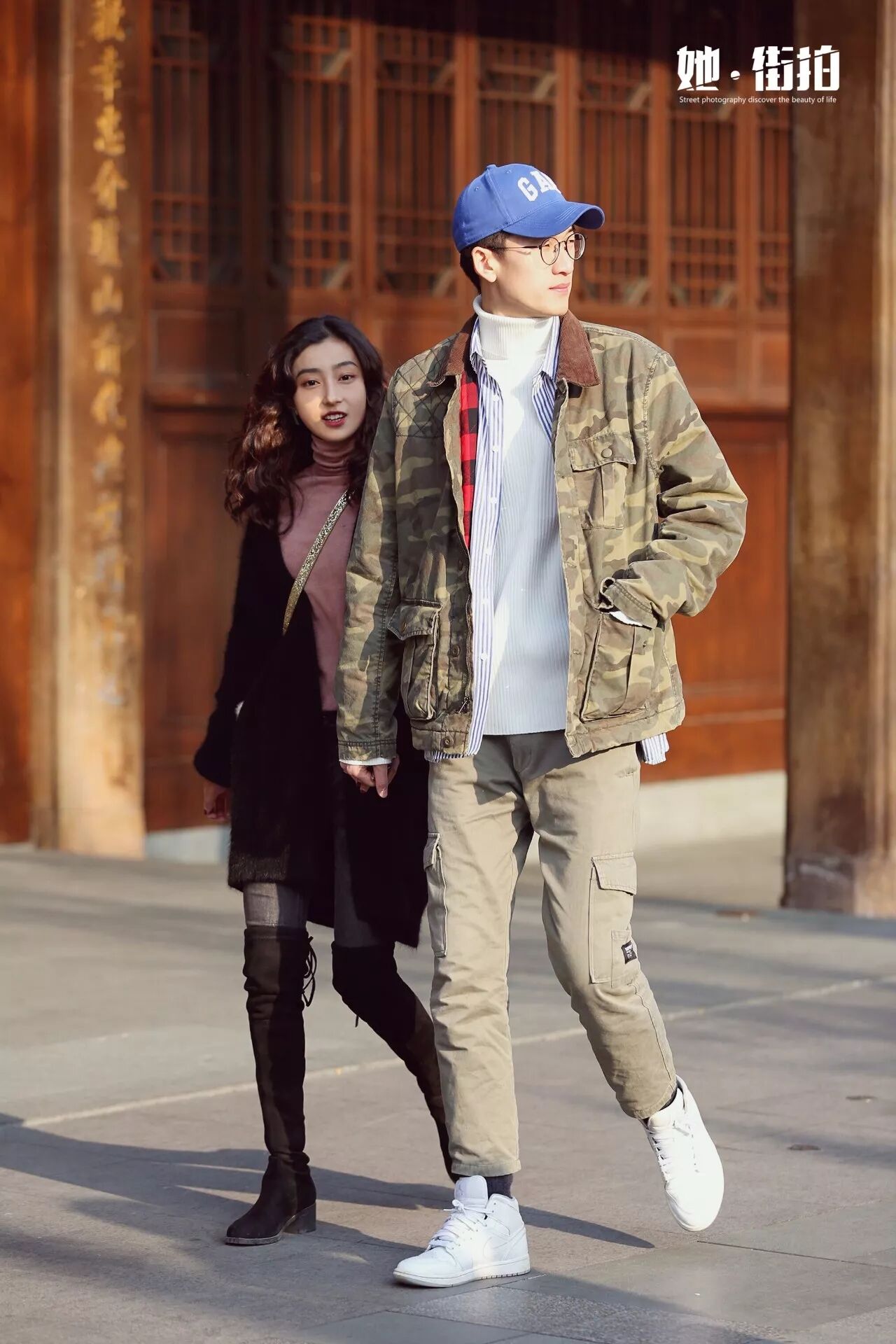 叠穿蓝色条纹衬衣,白色+蓝色似天空白云一样让人舒心的配色。外搭做旧的羊羔毛迷彩工装外套和墨绿色休闲裤,换成暗淡的内搭颜色,会过分陈旧无光。小白鞋和蓝色棒球帽整体呼应内搭,怎么看都是阳光又干净的男孩纸了。