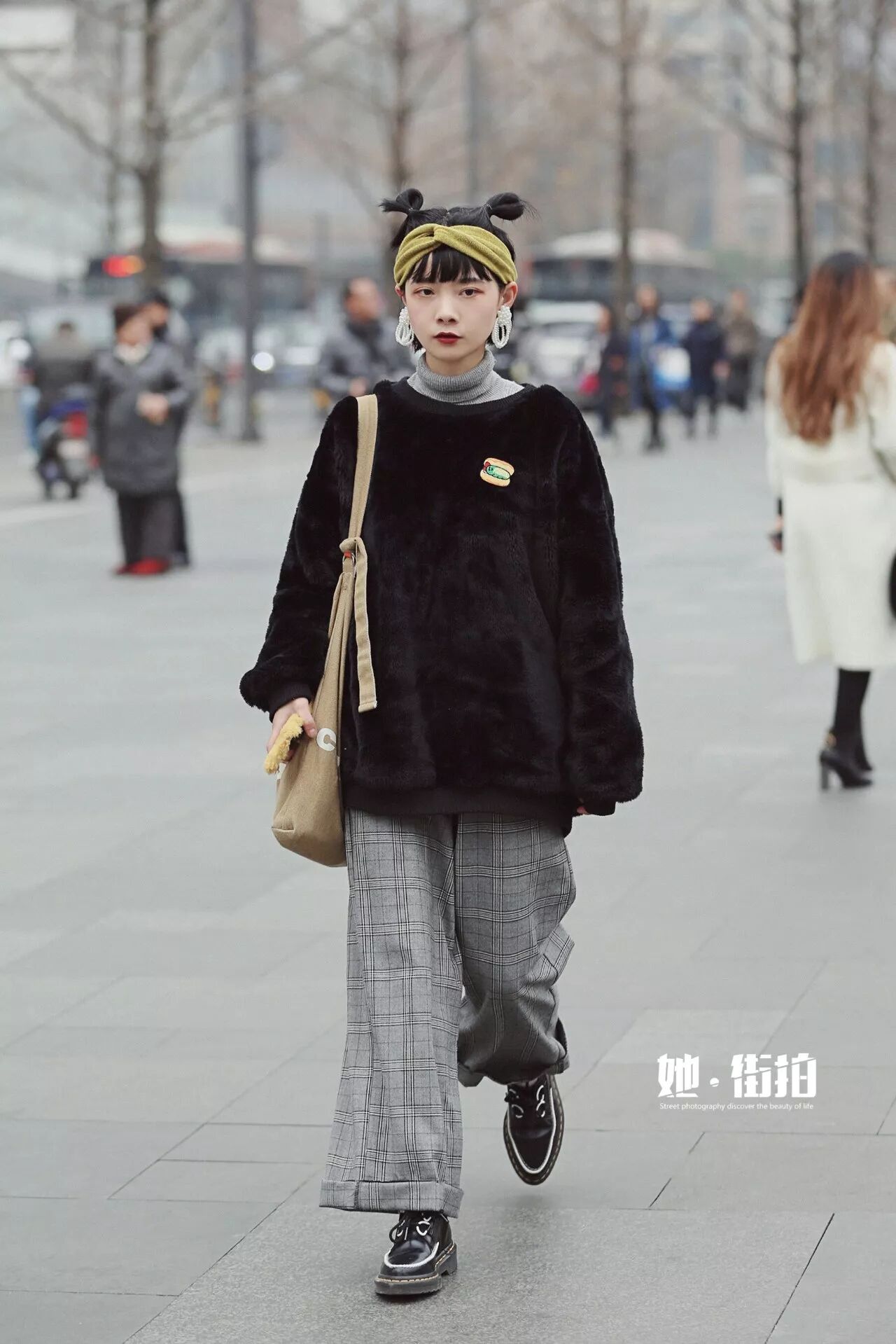 搭配爸爸风十足的威尔士格纹阔腿裤,真有一种小女孩偷穿爸爸衣服的调皮。卡通元素的胸针和芥末绿的发带加上俏皮少女感满分的哪吒头,酷酷的复古暗黑系中还带着可爱风~