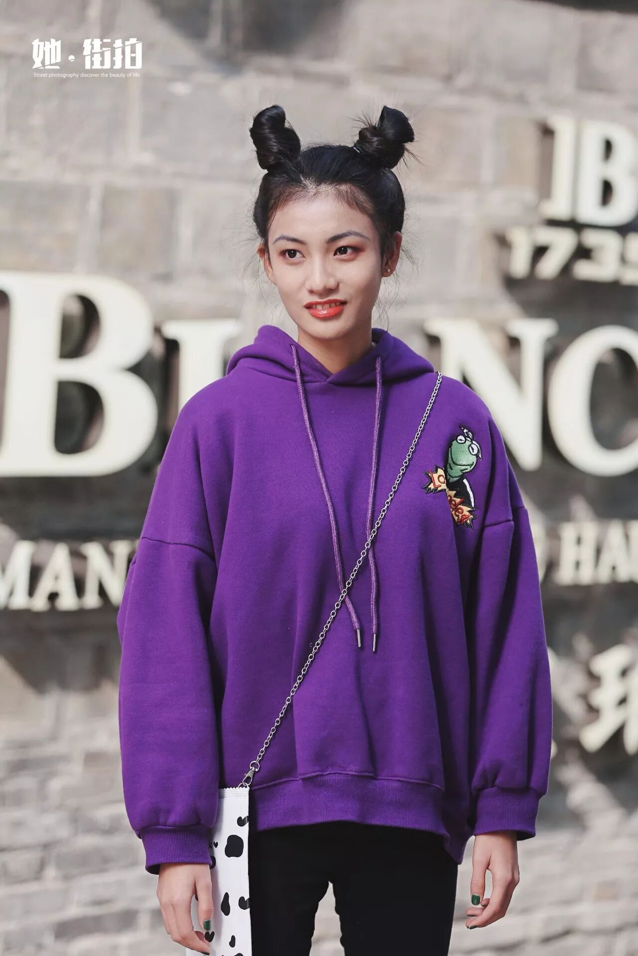 在整体黑色的上身搭配中,选择带有LOGO或印花的卫衣,更能增添趣味性哦。