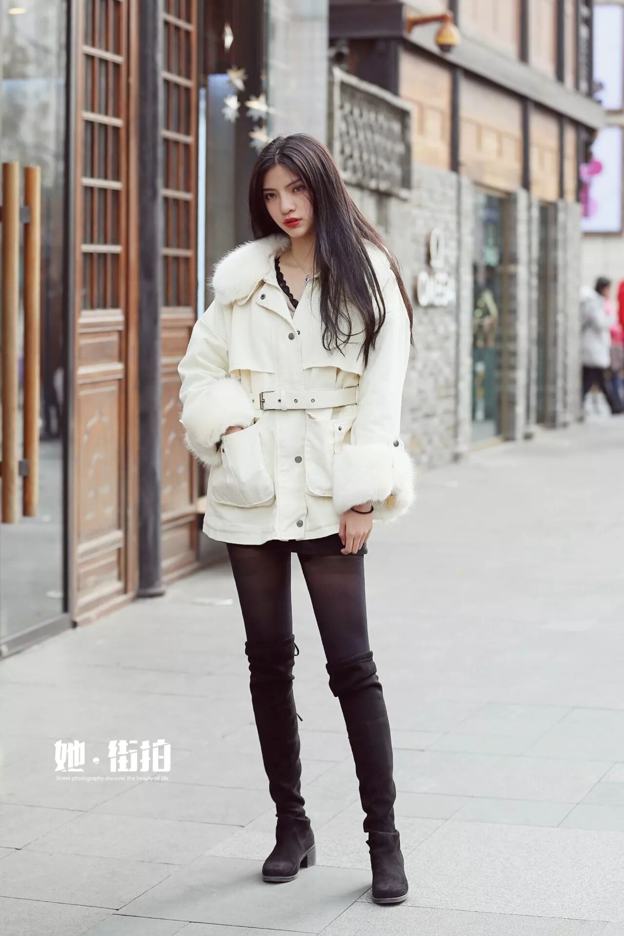 小姐姐搭配乳白色风衣式外套,腰带设计,能划分四六黄金比,加上短裤、过膝靴,轻松穿出婀娜有致的曲线和长腿。