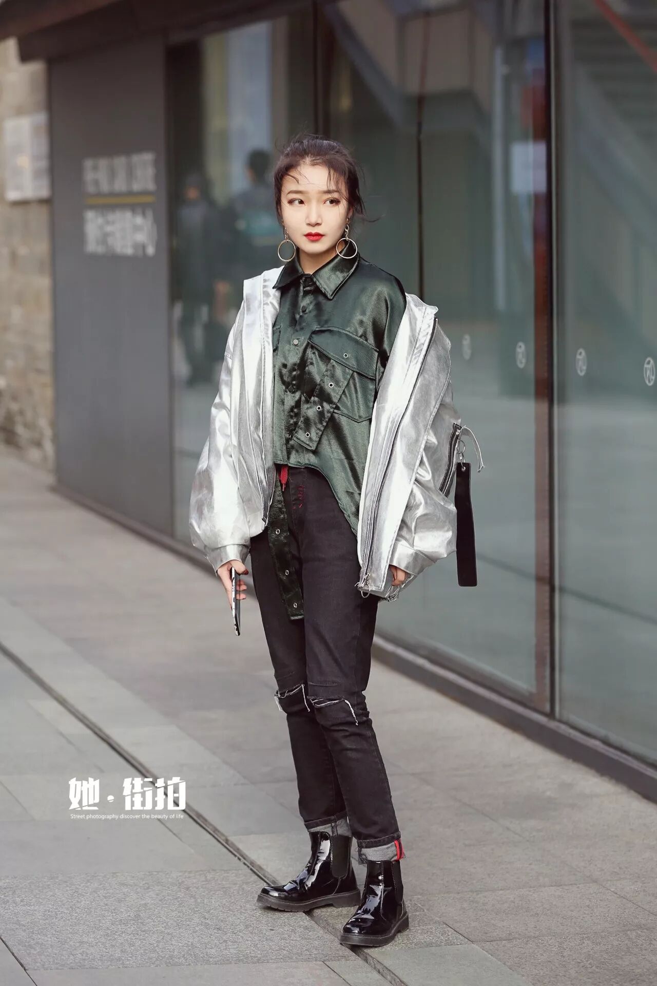 棒球夹克街头运动感十足,搭配休闲的破洞直筒牛仔裤和切尔西短靴,给人探索神秘的勇敢活力的feel~