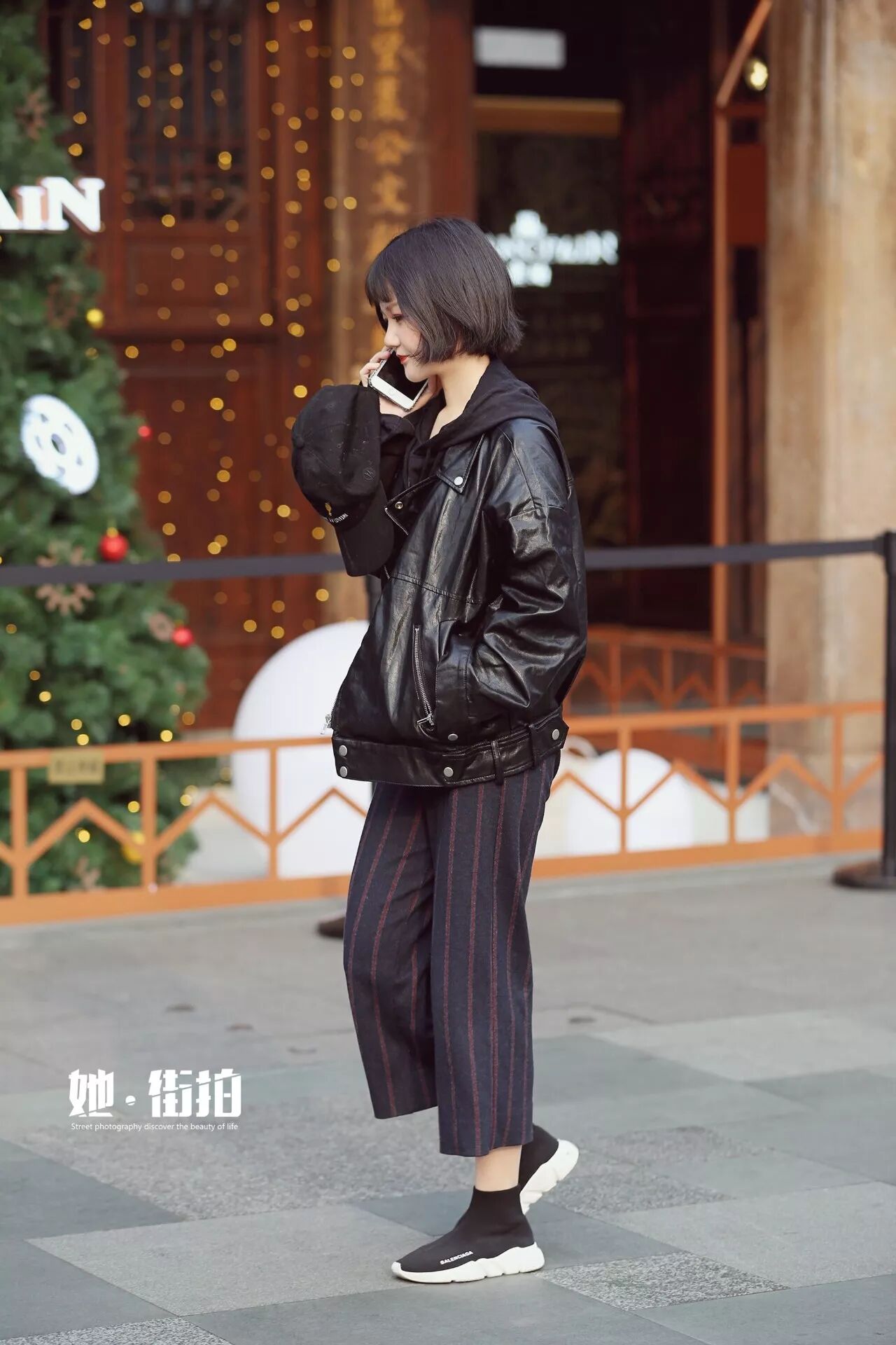 条纹阔腿裤能包容下半身的缺陷,九分的长短最显身高,一双Balenciaga的袜靴,包裹住纤细的脚踝,让视觉上更显腿部的纤细。