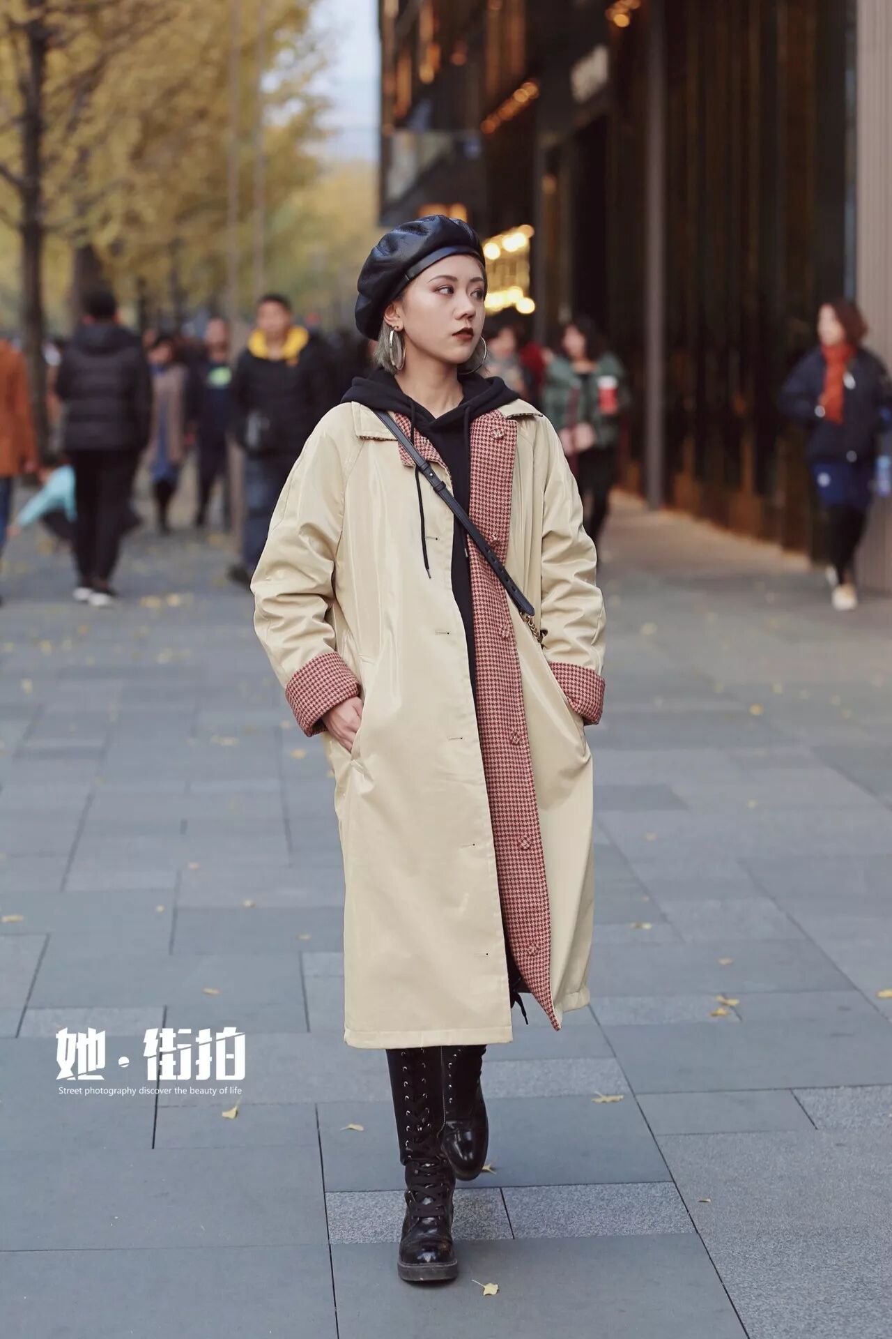 内搭一件黑色的连帽卫衣,酷帅中有着典型英式的优雅,整体黑色的内搭,视觉上更显瘦哦,呼应小姐姐欧美的妆容和皮质贝雷帽,帅气又甜美。