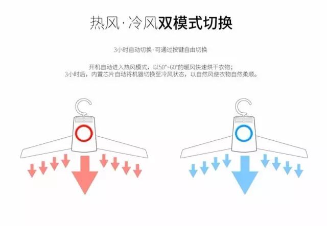一键式按钮操作,颜色变化即显示工作状态与吹风效果。红色是暖风的快速干衣模式,全程维持在50-60度,不必担心高温损坏您娇贵高档的衣衫;三小时后会自动切换到冷风,智能节电、安全保证不说,还可以保证衣物自然柔顺。