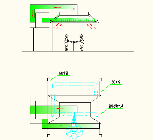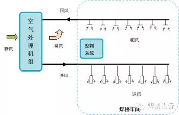 根据焊机集中布置的特点,将两至四台焊机构建成一个独立的半封闭工作间,利用焊烟悬浮特点,将焊接烟尘收集至净化设备中,净化后的气体通过送风管路排至工作间,形成组织气流,既节省空间,又达到高效净化效率。