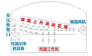 在厂房一侧墙面布置轴流风机,将焊烟吹向另一侧墙面的负压收集口。当厂房跨度较大时,也可在中间跨布置接力诱导风机。产生焊烟的源头应尽量布置在下风侧。