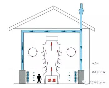 在有热源的车间,由于在高度上具有稳定的温度梯度,如果以较低的风速(v<0.2~0.5m/s),较大的风量,将送风温差较小(Δt=2~4℃)的新鲜空气直接送入室内工作区,低温的新风在重力作用下先是下沉,随后慢慢扩散,在地面上形成一层薄薄的空气层。而室内热源产生的热气流,由于浮力作用而上升,并不断卷吸周围空气。这样,由于热气流上升时的卷吸作用,后续新风的推动作用和抽风口的抽吸作用,地板上方的新鲜空气缓缓向上移动,形成类似于向上的均匀流的流动,于是工作区的污浊空气被后续的新风所取代。当达到稳定时,室内空气在温度、浓度上便形成两个区域:上部混合区和下部单向流动的清洁区。