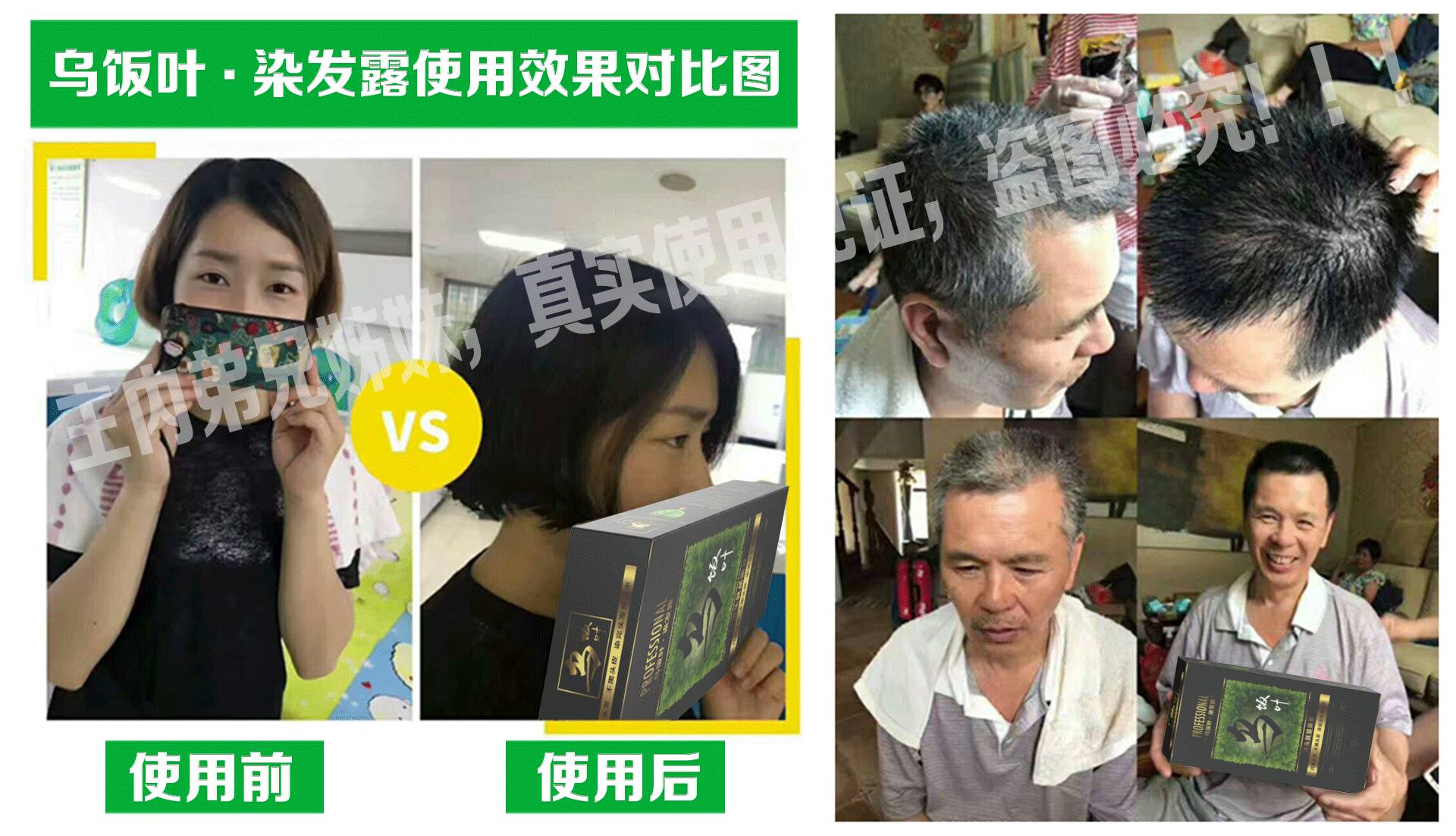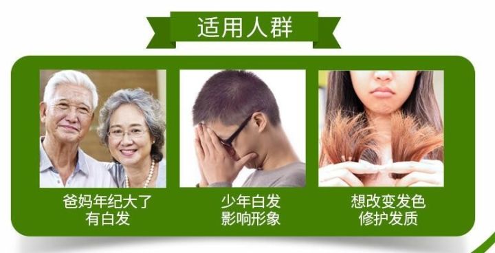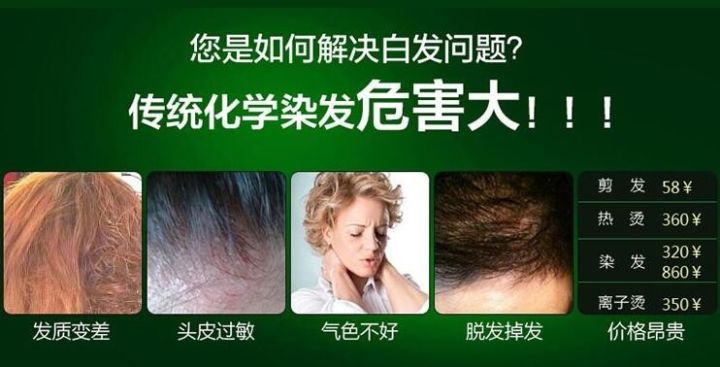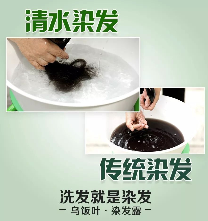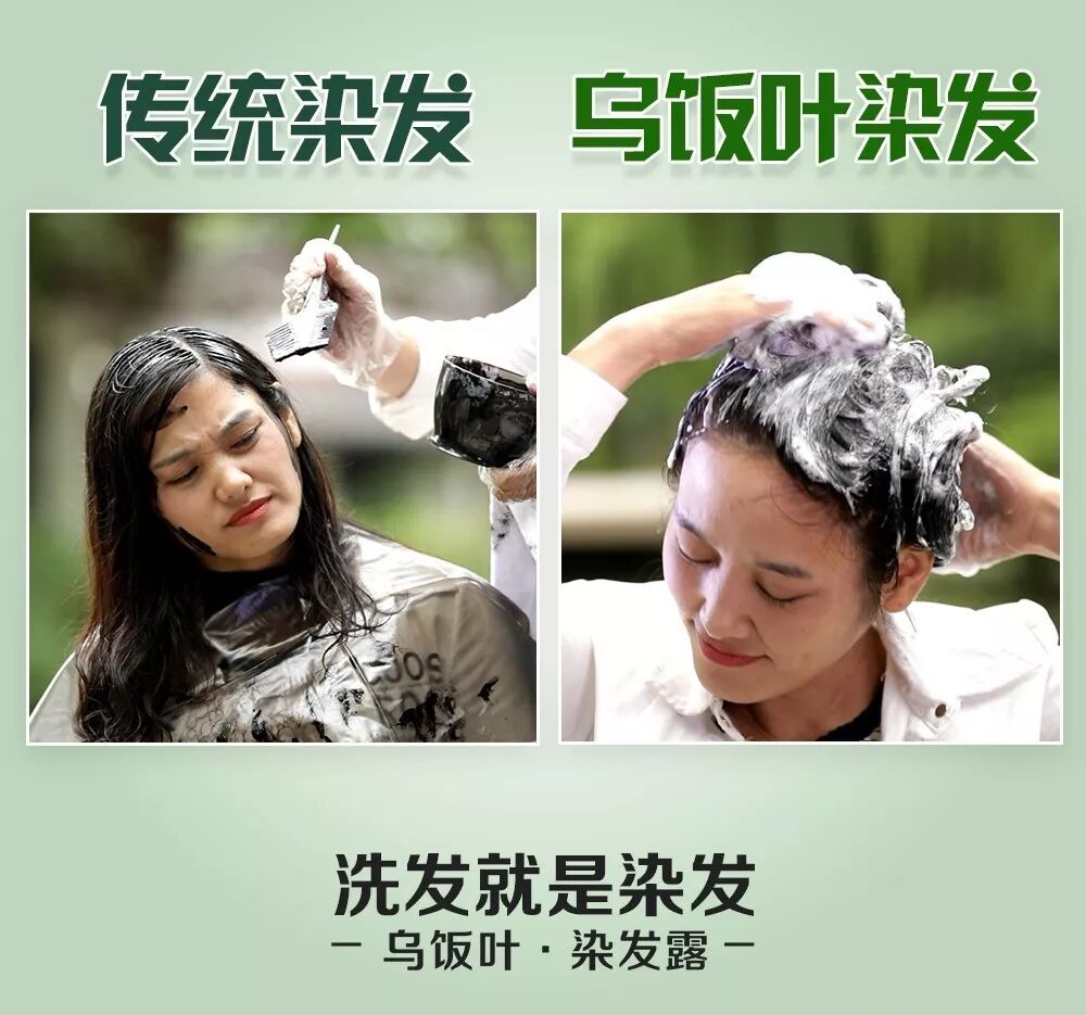 植物配方 乌饭叶,植物黑黄金! 乌饭叶精华,直达毛囊,激活黑色素分泌,修复受损发根,让头发由内而外自然快速变黑! | 化学制剂 传统染发膏,卖30元的跟卖300元的,其实都是相同的化学成分!只不过牌子不同! |