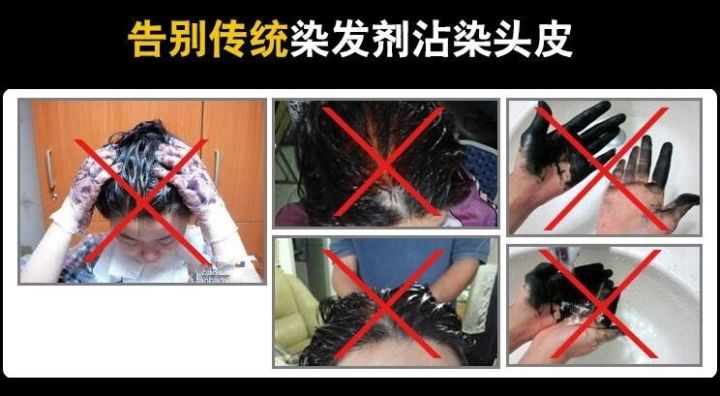 白色泡沫 洗头就是染发,只黑头发! 头皮、耳朵、脖子、双手…都不黑,只黑头发!!!跟洗头一样很清爽! | 黑色粘液 染发就是染发,哪里都黑! 耳朵、额头、脖子、头皮…粘到哪里,黑哪里!一看就知道你染发了! |
