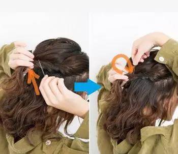 第五步:将发卡固定在扭转发丝上,翻转一周后,再固定在头上。