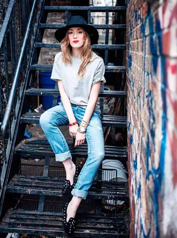 T恤和翻边牛仔裤搭配起来虽然简单,
