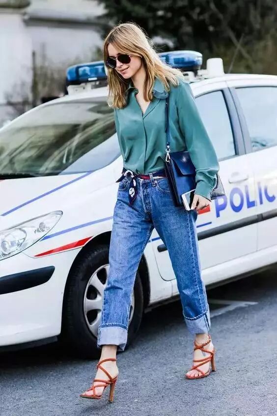 即便是翻边牛仔裤也能穿出淑女的感觉。