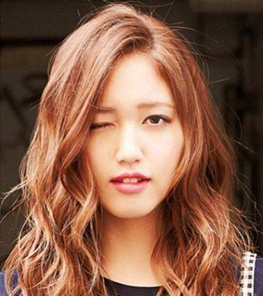 3、水波纹搭配偏分刘海是大饼脸妹纸的不二选择,优雅的偏分与中长卷发能很好的修饰脸型,水波纹的烫发与亚麻棕的染发颜色搭配起来,大方时尚。