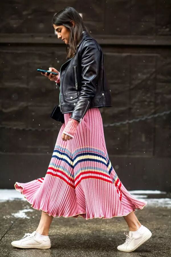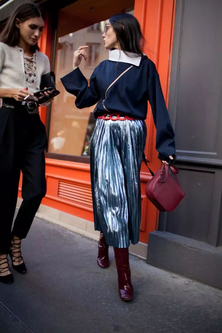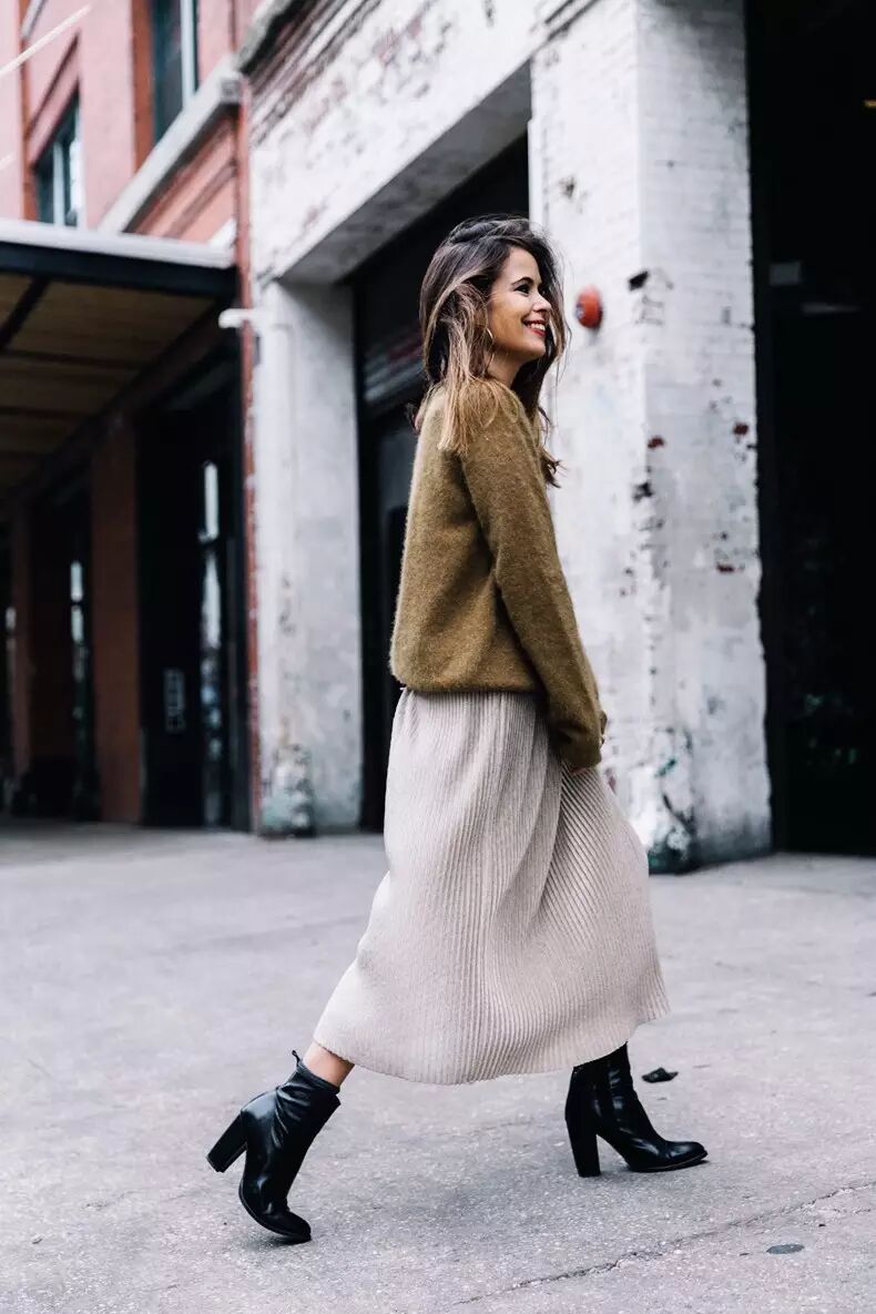 相比别的褶皱单品,褶皱半身裙,不管是什么长度,什么材质都是混搭的超级好帮手。在冬季,皮质或是针织的褶皱半身裙不仅能更好的御寒,也能给你完全不同的风格。