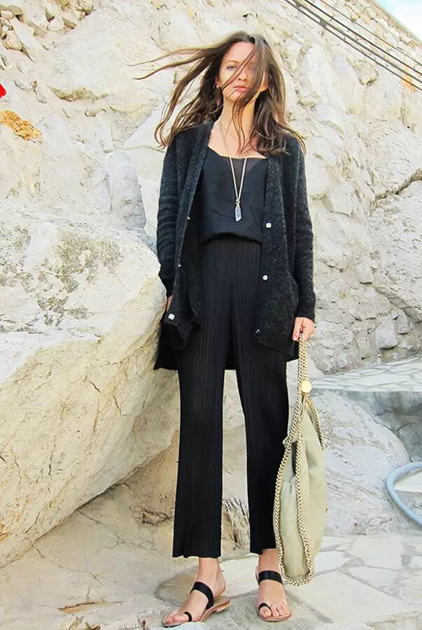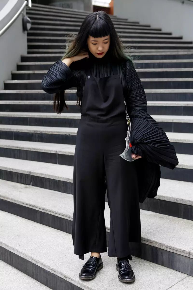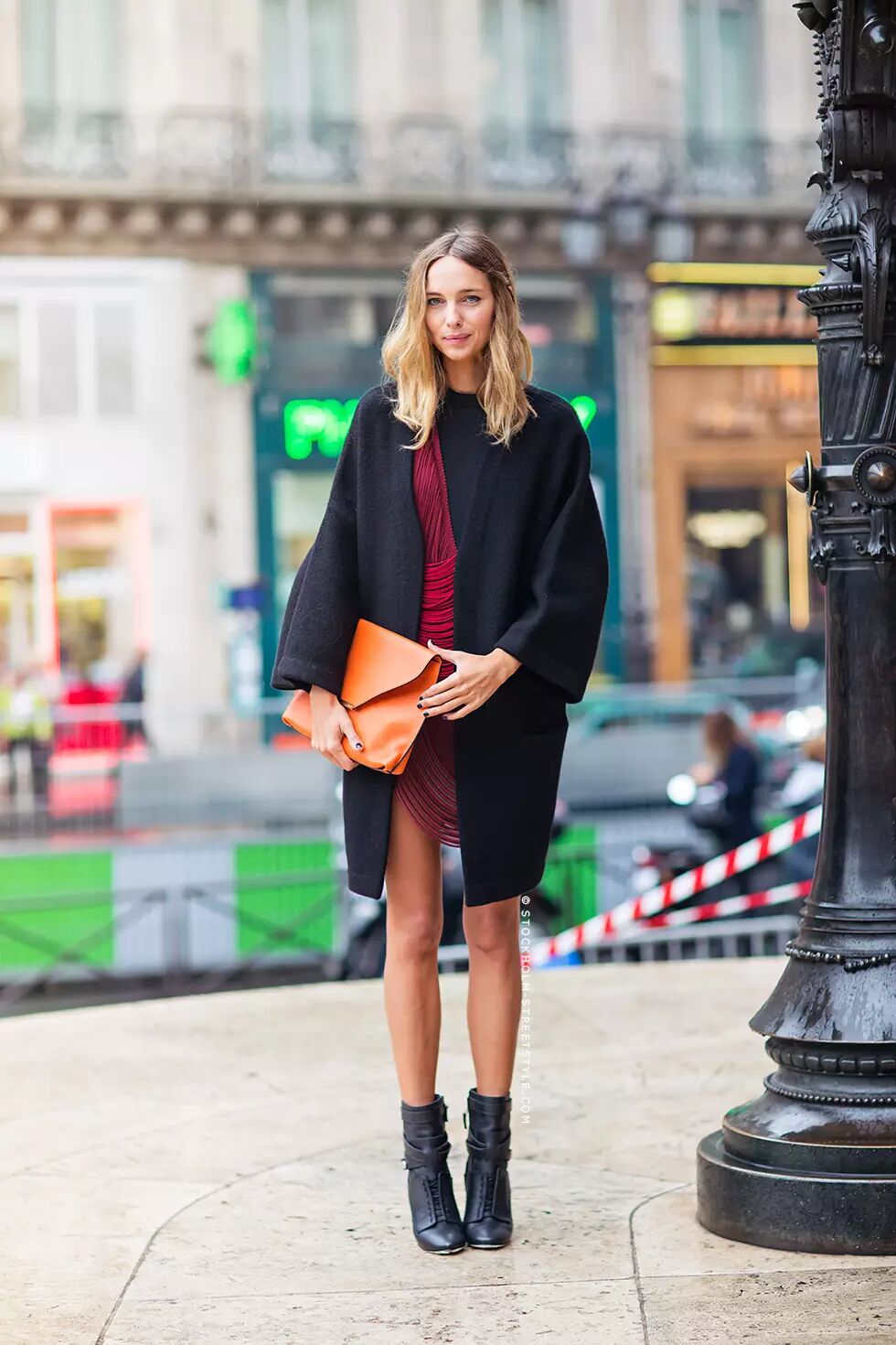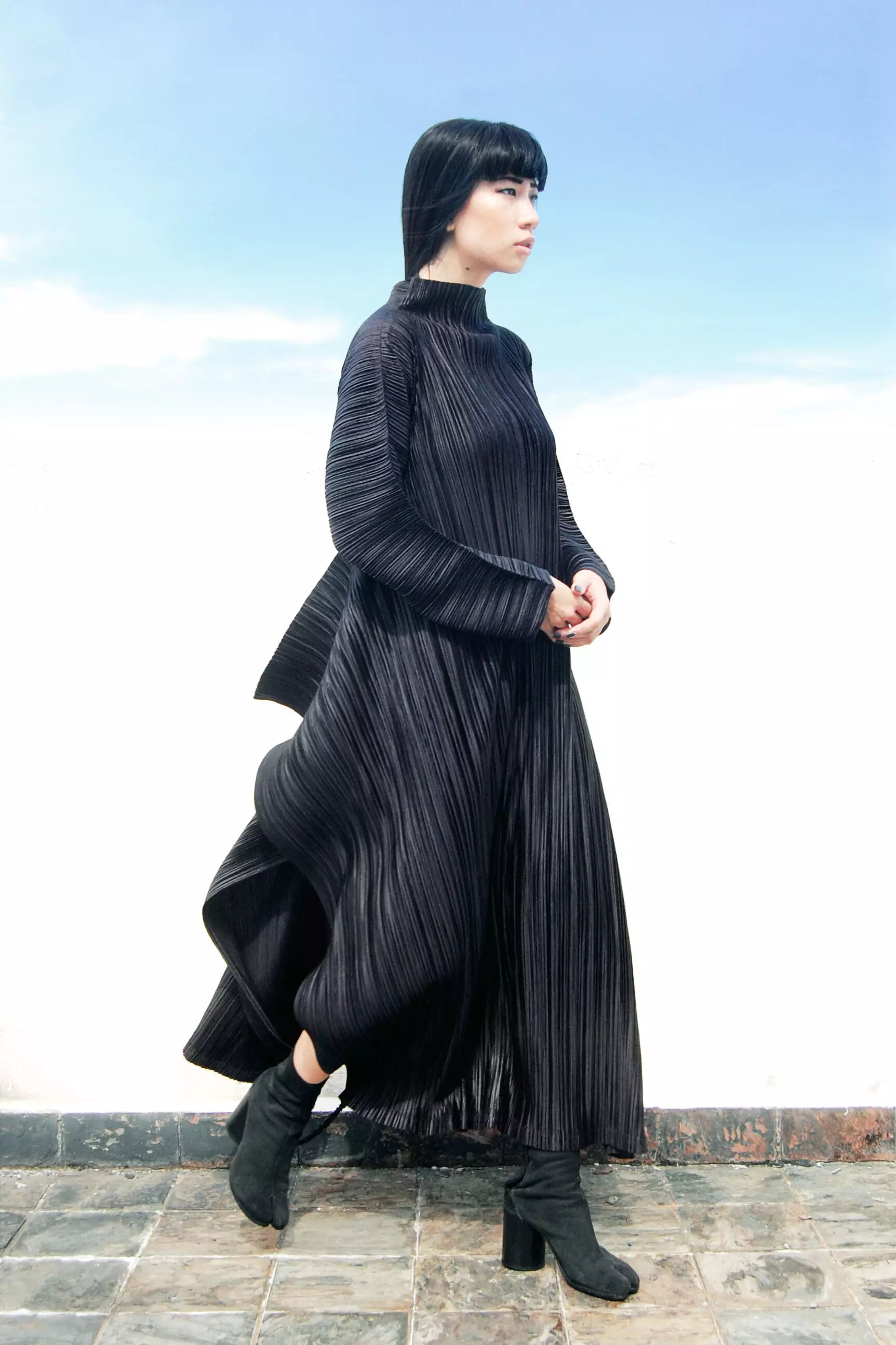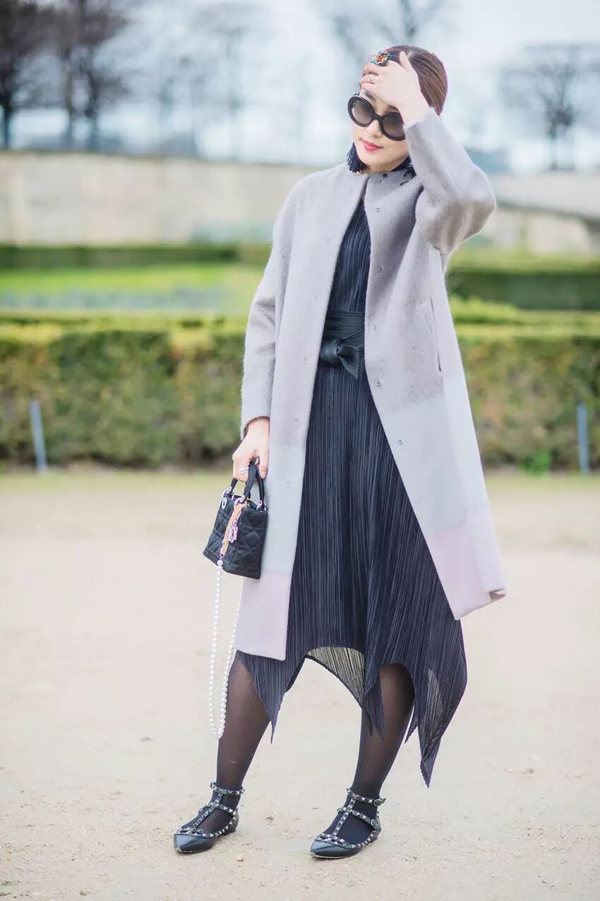 通体褶皱的连衣裙已经非常有造型、存在感,所以没有很大的把握选择单色或简单拼色的款式就好,同样风格的大衣、极简的毛衣都是不错的搭配。
