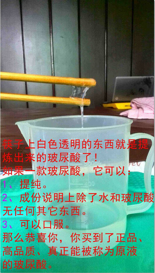 下图筷子上的透明物就是提炼出来的纯玻尿酸了。只有纯度高的玻尿酸才可以被提炼出来喔。