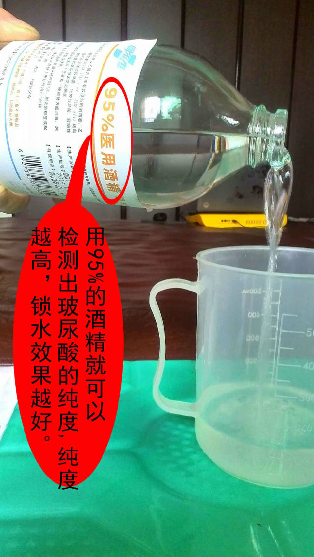 首先准备一瓶95%的酒精,一定要95%的才行喔,原因嘛,当然是玻尿酸是100%溶于水,所以也能够被100%的吸收进皮肤,如果酒精浓度不够,就相当于你把玻尿酸倒进了水里,它与水溶在一起了,当然就提不出来。95%的酒精一般在药房都有卖的。