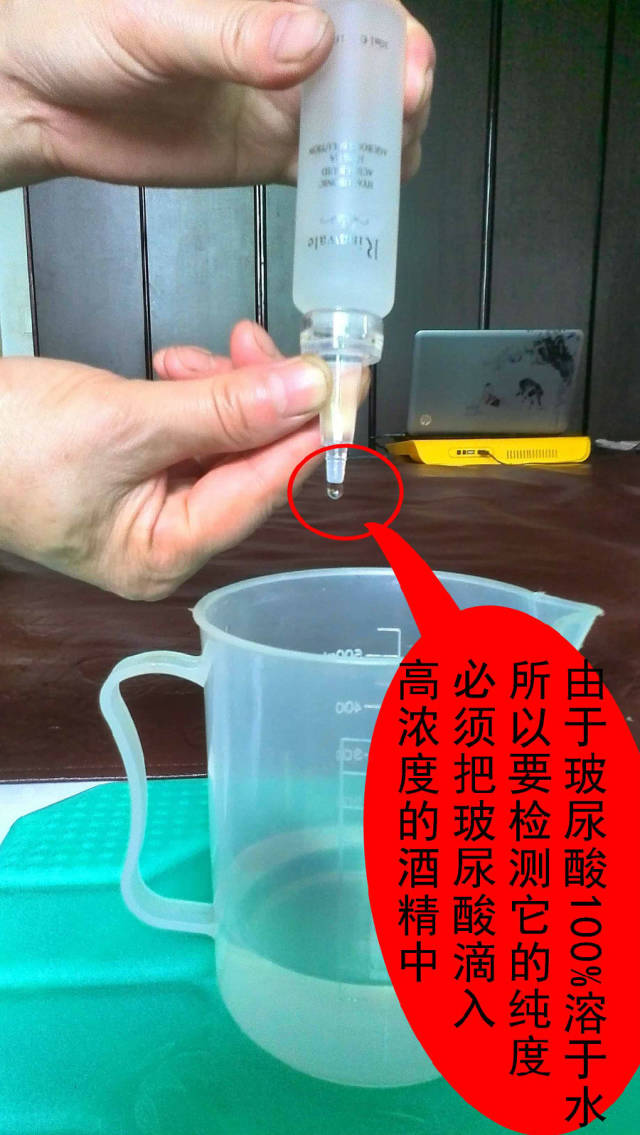 用筷子搅拌盛有酒精与玻尿酸的器械(最好是两支筷子),如果玻尿酸浓度高,筷子上就会缠上透明的东西,反之筷子上就什么也没有。