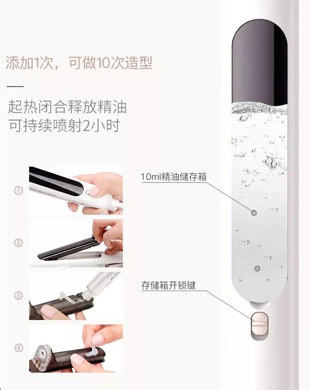 10ml的精油槽,1次装满,可以做10次造型,还可以重复添加,最高持续喷射2小时;