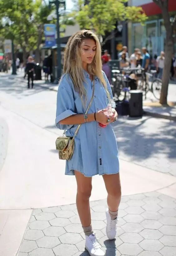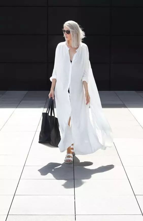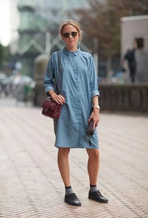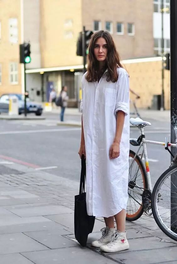 对于比较中性的女生来说,一件衬衫裙上身,并不会让你觉得不自在,因为没有太强调女性特征的元素存在,所以没什么违和感;尤其是这种直筒型的衬衫裙,既保留了衬衫的影子,还可以露出美腿做裙子使用。