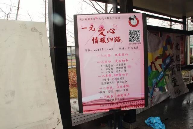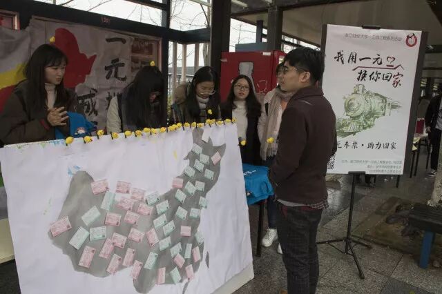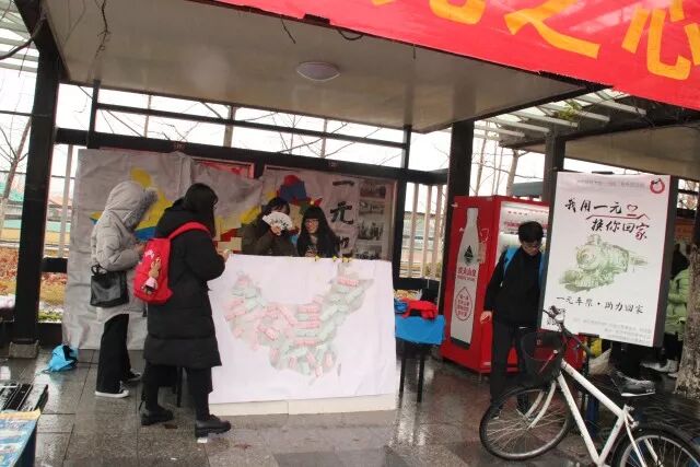“一元车票,助力回家”绘制了中国地图,让大家用彩色卡纸在不同地区写上祝福语,为寒冷的冬季增添爱的温暖。