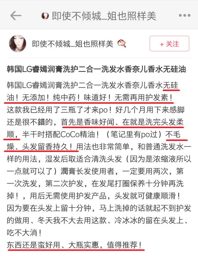 有一点值得说得就是,市面上很多不含硅的护发产品,因为不含硅,洗发之后都会有干涩的现象。但是,LG睿嫣润膏无硅油洗护合一洗发水采用了九蒸九干的古方制法。九次气蒸提炼精华,九次干法烩制精华,让洗发护发二合为一,深层滋养头发,修复受损。洗完头之后一点干涉的感觉都没有,反而有种很顺滑的感觉,不是含硅洗发水的那种假滑,而是真真正正的头发受到滋养的柔顺感!