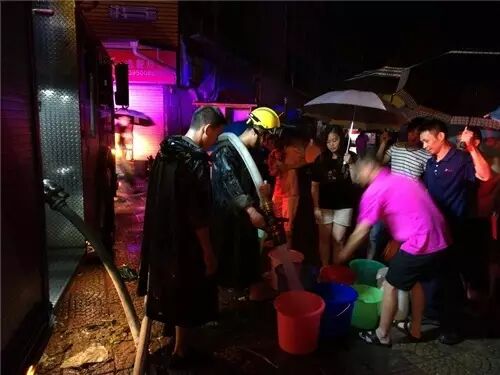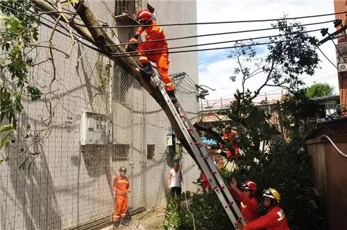 因台风造成停水,翔安区马巷移动通信枢纽大楼机房空调水冷系统难以运转,导致通信枢纽瘫痪,全省近千万移动用户的通讯将受影响。情急之下,移动公司想到了消防。17日下午,市消防车赶到现场,根据消防水池容量,消防官兵一次性灌注90吨消防水,缓解了移动通信枢纽的无水之困。 安全造成威胁,经过三个小时的努力,五楼竹质脚手架被拆掉,险情被成功排除。 同安区阿忠饭店后面有两棵大树倒塌压住电线,影响电力部门供电进度,大同中队中队长刘兴峰主动上阵,他爬上树干,启动机动链锯,对倾斜的树枝进行切割,另外一组官兵在树下对切割下来的树干进行分枝,一名官兵负责现场警戒,附近几名热心的群众见状,也参与到救援清理工作当中,经过近1个小时的努力,悬挂在电线上的树干被完全清除,隐患也被排除。 大量树木、铁皮被刮落,造成交通严重堵塞,市消防利用无齿锯、机动链锯等进行分割处理,分割后将零散的树枝放置路边堆放在一起,保证道路畅通。![]()