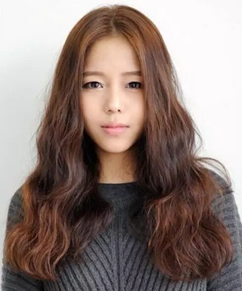 3、头发多的女生可以尝试这种水波纹烫发,烫发的纹理蓬松慵懒,好看的同时还很修颜,刘海选择女神中分,配合黄棕色染发,时尚又漂亮呢!