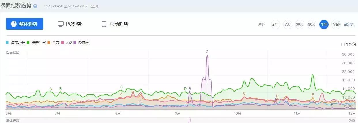 对此,网友对于海蓝之谜、雅诗兰黛、兰蔻、sk2和欧莱雅的搜索趋势如下:
