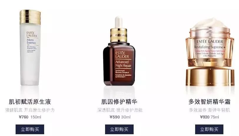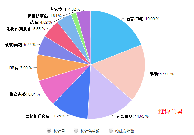 其中可以看到,与海蓝之谜相比,雅诗兰黛的搜索率稳高不下,所以,对于轻奢主义的女生来说,能够负担的起的消费才是她们的消费主流。那我们来看看消费者购买雅诗兰黛的产品主要是什么: