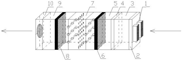1、进风口;2、取样装置;3、惯性除尘器;4、固定床活性炭吸附装置; 5、低温等离子装置;6、中效过滤器;7、紫外光与TiO2协同催化装置;8、高效过滤器;9、取样装置;10、出口风机