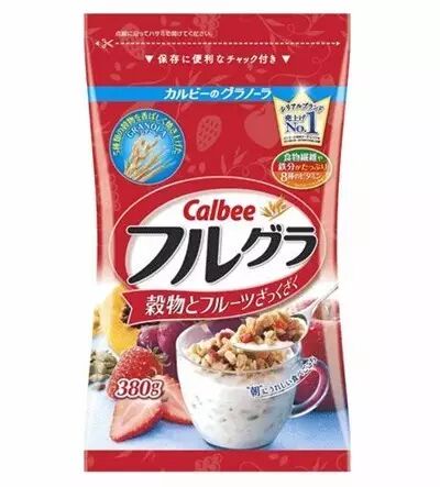 日本卡乐比Calbee的本款水果谷物营养麦片,富含铁分和8种维生素,吃一碗约50g等于补充了人体每天所需铁分和维生素的1/3。作为孕妇儿童的营养早餐和宵夜,方便又营养。可以直接当零食吃,也可以泡牛奶、泡酸奶、豆奶、豆浆,还可以泡稀饭吃,吃法多种多样。