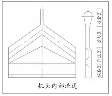 机头口模的流道结构直接影响着制品的发泡倍率和挤出均匀性,进而影响制品的质量。本生产线生产宽幅硬质 PVC 结皮发泡板材,采用衣架式挤出机头结构,机头内部流道组成如图 3,由歧管区、扇形区、阻流区和模唇区组成,