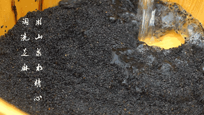 将筛选好的黑芝麻放在泉水中,捞掉漂浮在水面的不饱满的芝麻颗粒,然后用纱布把水滤掉,把黑芝麻堆里的水尽量挤出