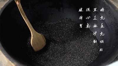 经历过九次蒸晒的黑芝麻,壳已经基本脱落,芝麻很容易就炒熟,控制住火候很重要,不能让黑芝麻炒糊了,炒出香味以后就可以停手,然后静待黑芝麻冷却。