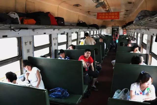 那时的火车是绿皮车。在嘈杂拥挤的火车站,车厢里列车员来回穿梭叫卖。