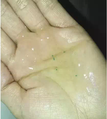 润膏红色,质地略稠。吕半透明颜色,质地略稀薄。