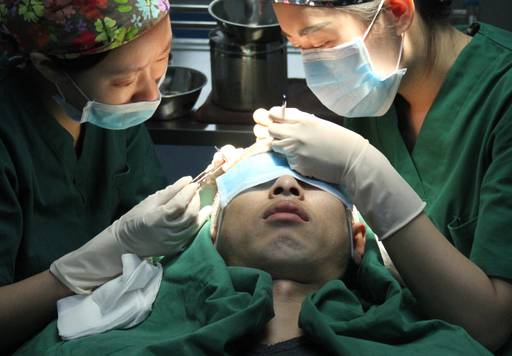 植发手术开始了,图为(2016年11月18日拍摄)植发手术中的照片,只见他本人也是很轻松的。