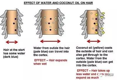 巧用护发精油。在前面的帖子里我提到过好几次护发精油,而最近的天气使用护发精油,简直不能更合适,我尤其推荐在洗头发后,半干的头发上使用,将精油涂抹在半干的头发上,从头发中部到尾部均匀涂抹,之后再吹干或者自然晾干。头发还有点湿的时候,护发精油容易涂抹的均匀。而且,头发湿的时候是吸水溶胀,毛鳞片翘起的,这个时候使用护发精油,之后再用吹风机吹干或者自然晾干,油很容易通过一个置换作用,随着头发里面水分的挥发而进入头发内部,从而减少了头发的溶胀,同时也起到了闭合修护毛鳞片的作用。下图是用椰子油作为示例,而现在护发精油常用的是硅油搭配植物油,其作用机理一样,而且硅油的滑感搭配植物油的滋润,比用单一的油脂效果更好。