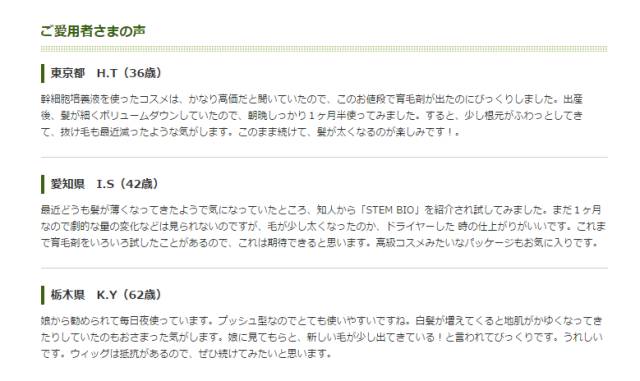 最近注意到好像头发变少了,因为熟人那里介绍“STEM BIO”,所以尝试了一个月。因为才1个月,戏剧性的变化是看不见的,不过,毛发稍微开始粗了,吹风机吹的的时候的,头发完好不会掉落。到现在为止有试了各种各样的生剂,我认为这款的效果值得期待的。高级化妆品样式的包装我也很中意。